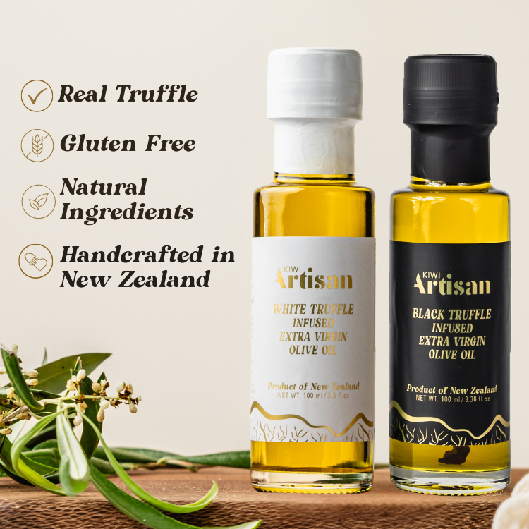 First press oil from olives grown south of Auckland, which infuses with the truffle extract and shavings, to create our New Zealand Black Truffle Olive Oil.